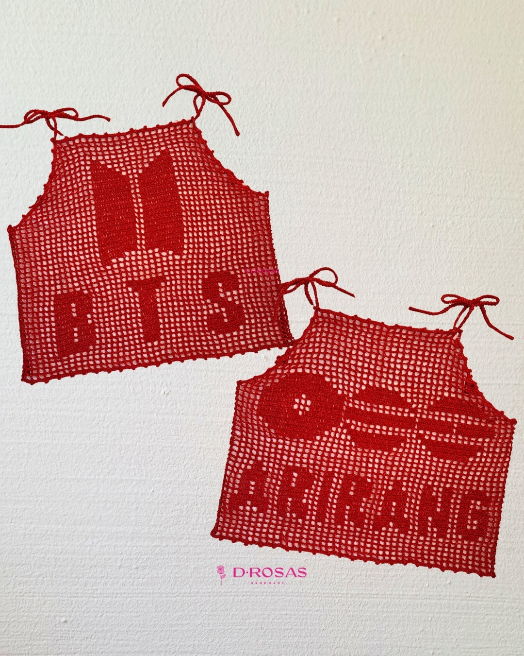 Tejida en crochet con todo el amor solo para ti. Si la quieres customizar en otro color, además de rojo y morado BTS, por favor contáctame para hacer realidad el top que más quieres.